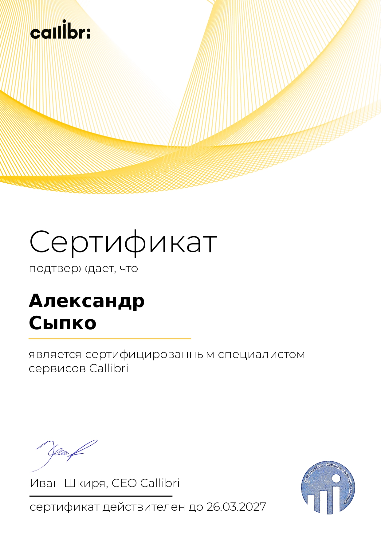 Получили сертификат Callibri